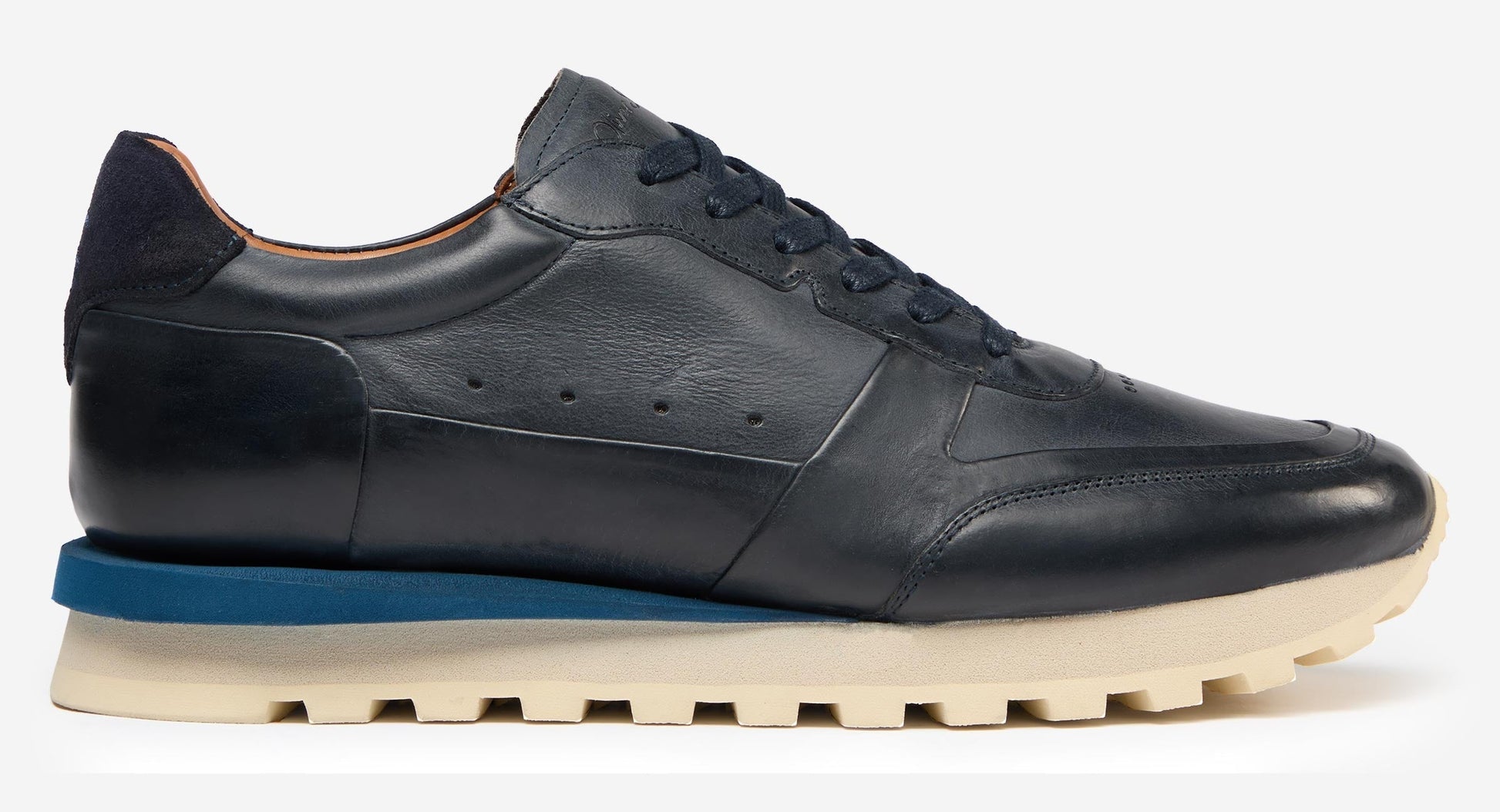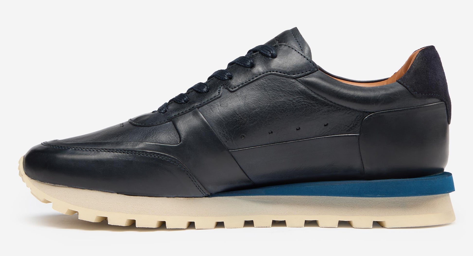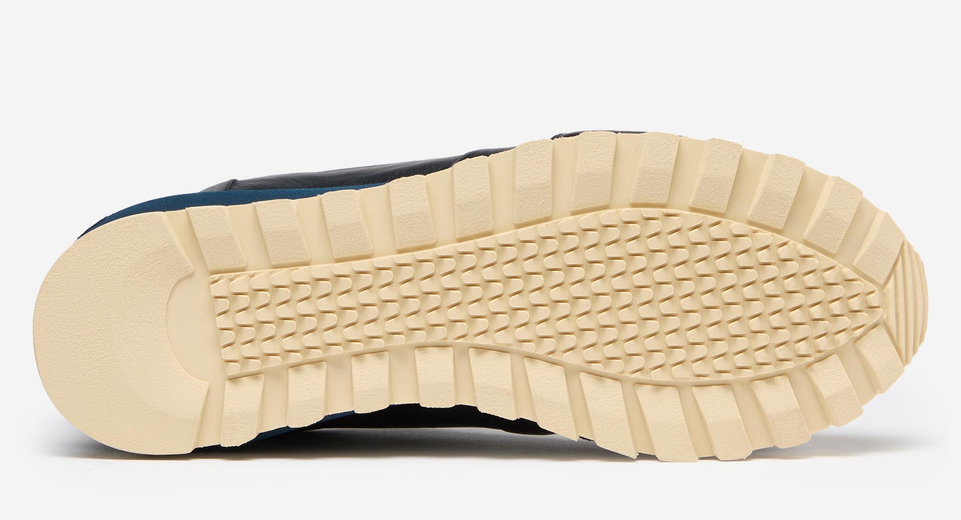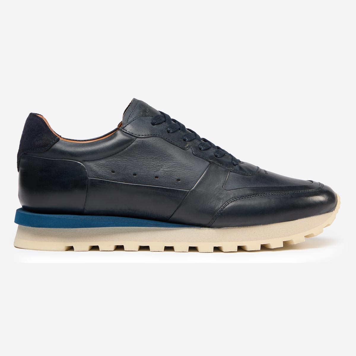 Our retro runner is made from navy Garda leather. This is a fine smooth calf leather with naturally casual colour. The upper features retro styling with neatly folded seams around the toe guard, quarters and back counter. We have however used the best of modern technology to bring the comfort right up to date. This is a super comfortable runner with a full leather lining, cushioned leather insock, padded tongue and collar with a soft suede back. The neutral coloured outsole has a deep profile with a cleated tread and is made from light weight EVA with an additional blue insert at the heel.